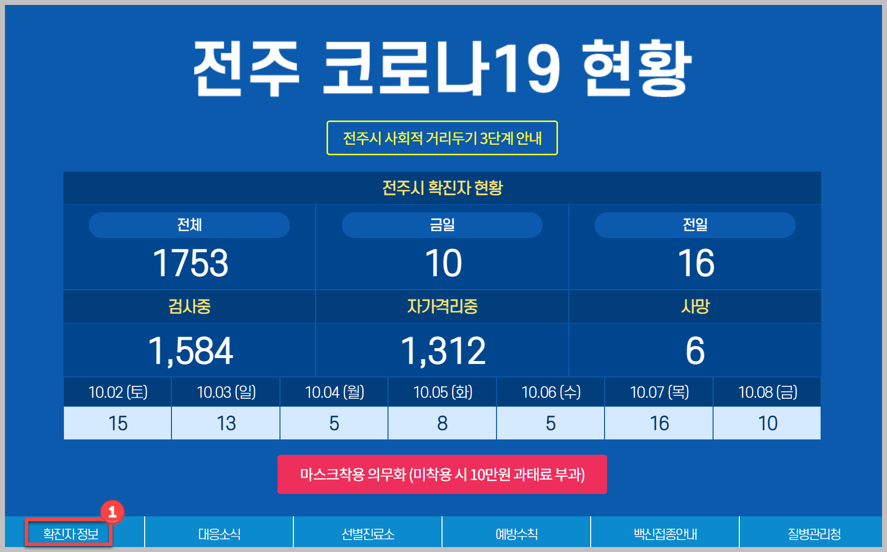코로나19와 관련된 정확한 정보를 얻기 위해서는 지자체 홈페이지를 방문하시면 됩니다. 전주시에 거주하시는 분은 전주시청 홈페이지에 들어가시면 됩니다. 이곳에는 전주시안에 발생하는 확진자를 비롯하여 코로나 정보를 얻을 수 있습니다.