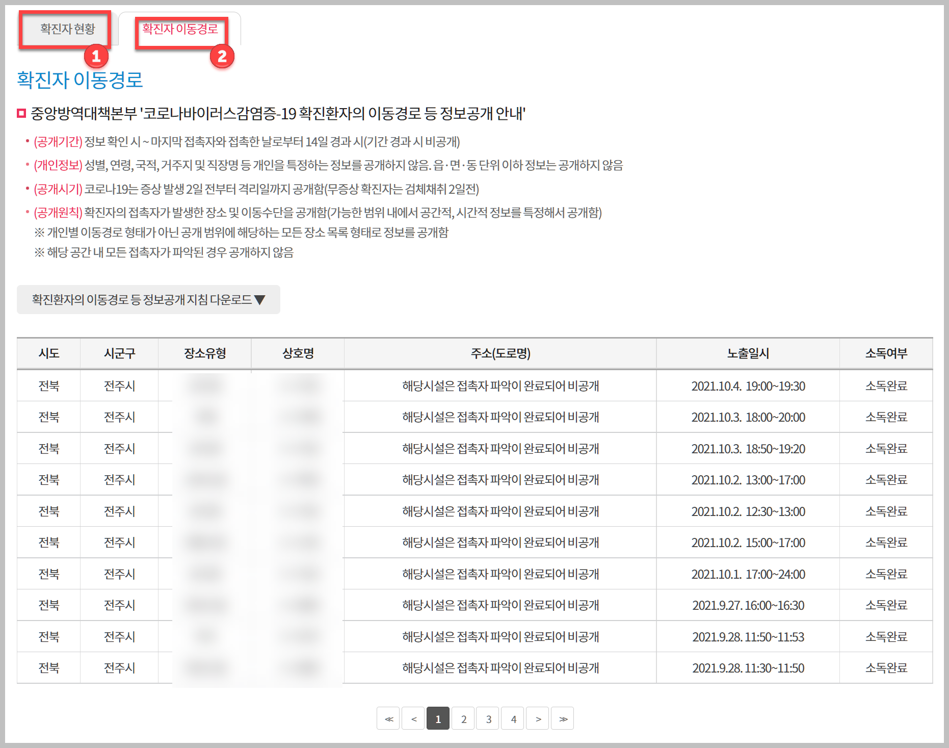확진자 정보를 클릭을하면 위와 같은 화면을 볼 수 있습니다. 확진자 현황과 확진자 이동경로를 한눈에 볼 수 있습니다. 이 외에도 다양한 코로나19와 관련된 정보를 전주시청 홈페이지에서 얻을 수 있습니다.