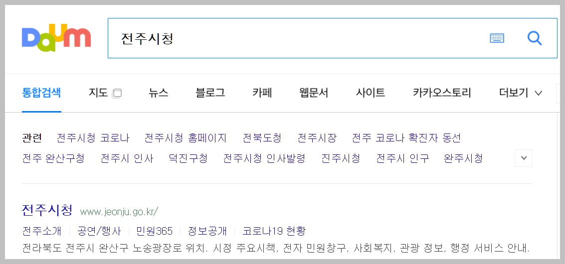 위 화면은 다음에서 검색을 했을때의 모습입니다. 네이버와 비슷하지만 조금은 다른 모습입니다. 하지만 동일하게 가장 맨 위에 검색결과가 나오게 됩니다.