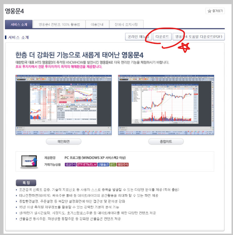 위 링크로 들어가시면 손쉽게 키움증권 HTS 다운로드가 가능합니다. 키움증권 메인페이지부터 여기로 들어가는데 꽤나 복잡하니까 링크를 이용하시는것이 편합니다.