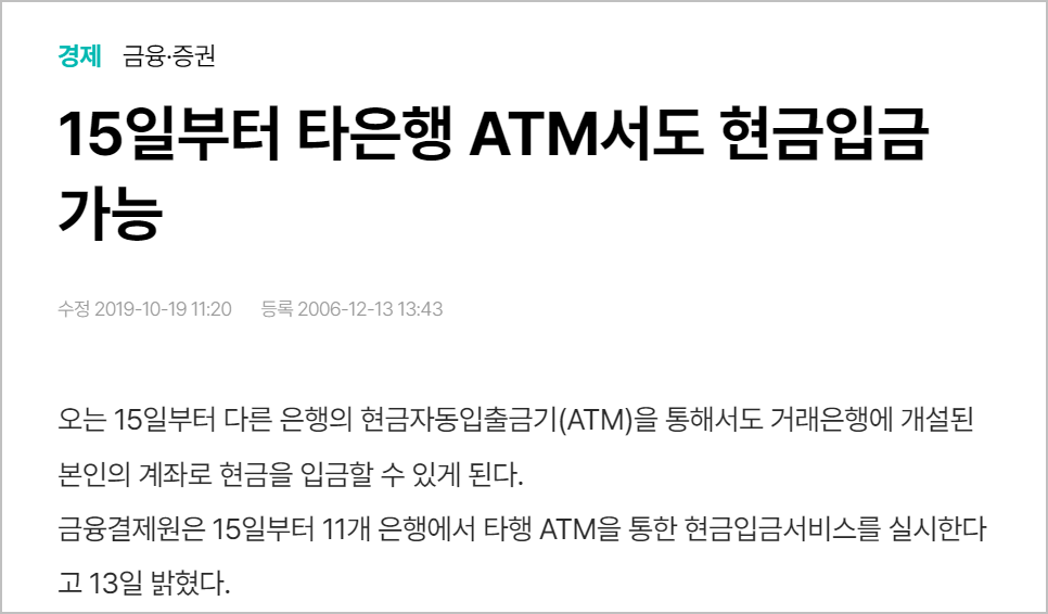 그러다보니 자동화기기에 대해서 굉장히 잘 알게되어서, 어떠한 기능이 있는지 정말 잘 알고 있지요. 최근에 와이프가 타은행 ATM 입금이 가능한지에 대해서 묻더라구요. 저도 과거에는 안되었던것으로 기억하는데, 한번 뉴스를 찾아 보았씁니다.