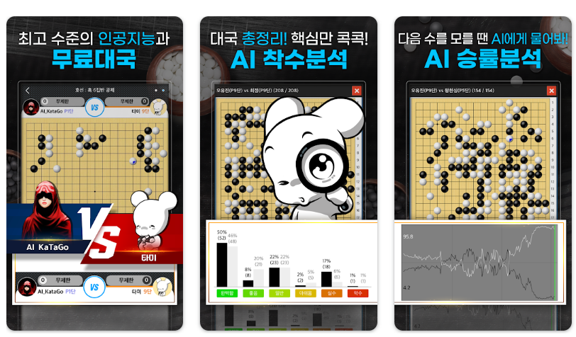타이젬바둑은 모바일 앱으로도 제공됩니다. 구글 플레이스토어나 앱스토어에서 타이젬바둑을 검색하여 다운로드할 수 있습니다. 최근에는 SNS 계정을 통한 간편 로그인, AI 승률 분석, 9줄 대국 등 다양한 기능이 추가되며 사용자 편의성을 높였습니다.