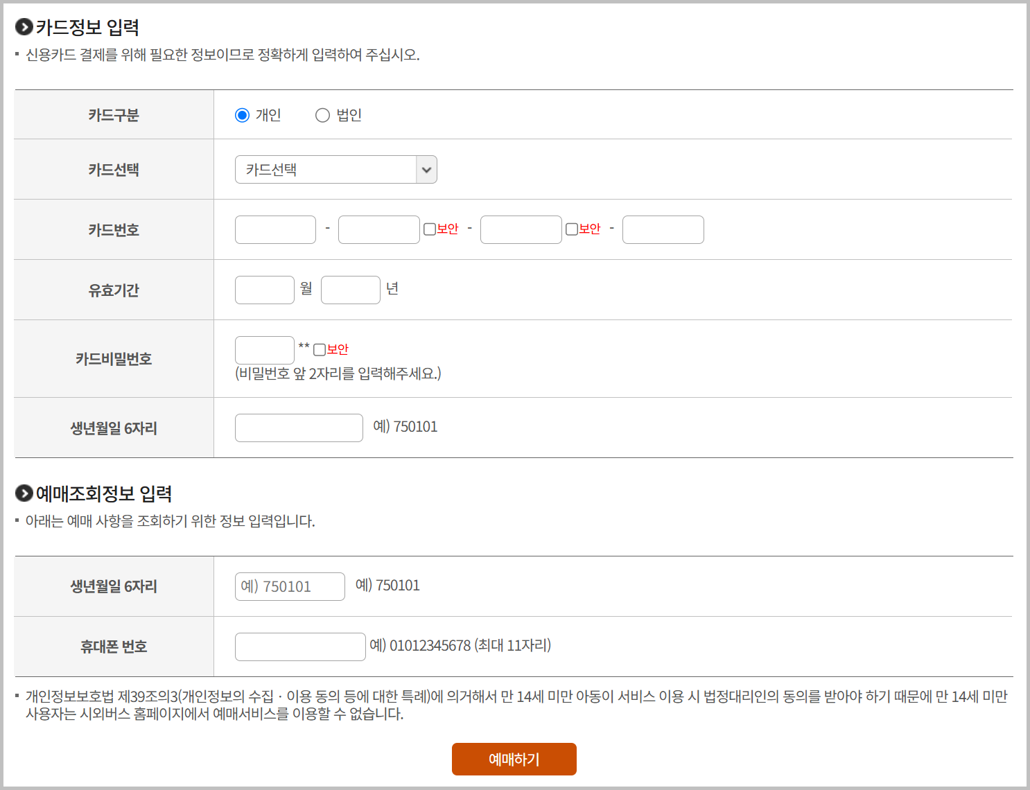 이후에 정보제공에 전부 동의한 다음에, 카드정보를 입력합니다. 앱을 통해서 하면 이 과정이 조금은 편하지만, 컴퓨터를 통해서는 하나하나 다 입력해야하는 귀찮음이 있습니다. 그리고 예약한 카드를 꼭 가지고 매표소로 갑니다. 안그러면 많이 귀찮아 집니다. 표를 받지 못할수도 있어요.