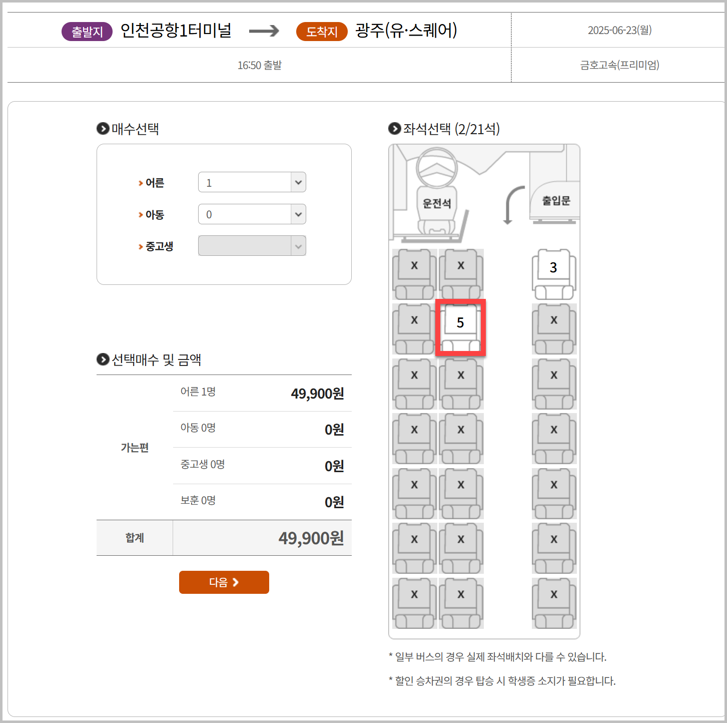 좌석을 선택합니다. 인원수가 2명이라면 2개를 선택하고, 1명이라면 1개를 선택하시면 됩니다. 위 이미지는 프리미엄이라서 좌석 수가 그리 많지 않습니다. 장거리라 프리미엄을 타는것이 여러모로 편하긴 합니다.