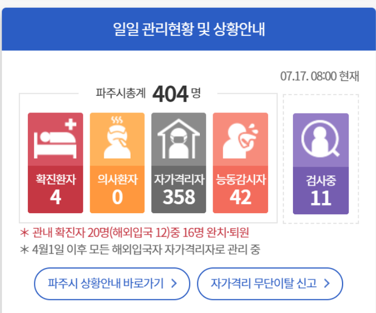 그리고 현재 파주의 일일관리현황 및 상황에 대해서 확인이 가능합니다. paju의 현재 상황은 확진환자 4명, 검사중 11명으로 되어 있습니다. 꾸준히 파주시청 홈페이지에 접속을 해서 이러한 정보를 확인할 필요가 있을것 같습니다.