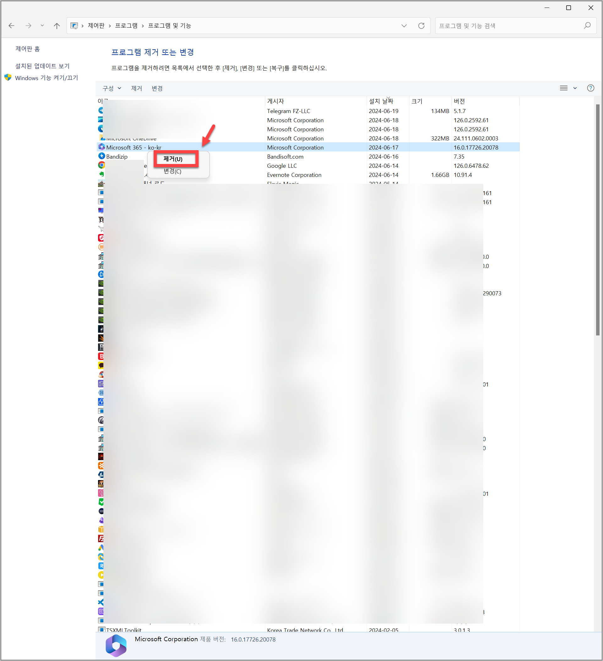 이후 삭제하고 싶은 소프트웨어를 클릭한 후 우클릭합니다. 그러면 '제거'라는 항목이 나오는데, 그것을 클릭하면 됩니다.