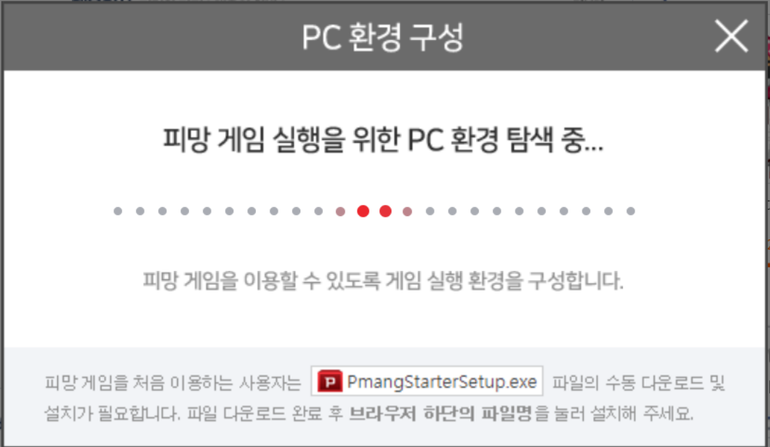 '입장하기'를 클릭하면 게임이 설치가 됩니다. 하지만, 피망 플랫폼의 게임을 한번도 설치해본 적이 없다면 위와 같이 피망스타터를 설치하도록 나오게 됩니다. 딱 한번만 설치를 진행해 주면 됩니다.