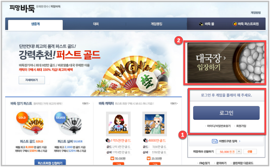 대국을 하기 위해서는 1) 로그인을 한 뒤에 2) 대국장 입장하기를 진행해야 합니다. 로그인을 하지 않은채 입장을 하려고하면 로그인을 먼저하라는 오류를 보내줍니다.