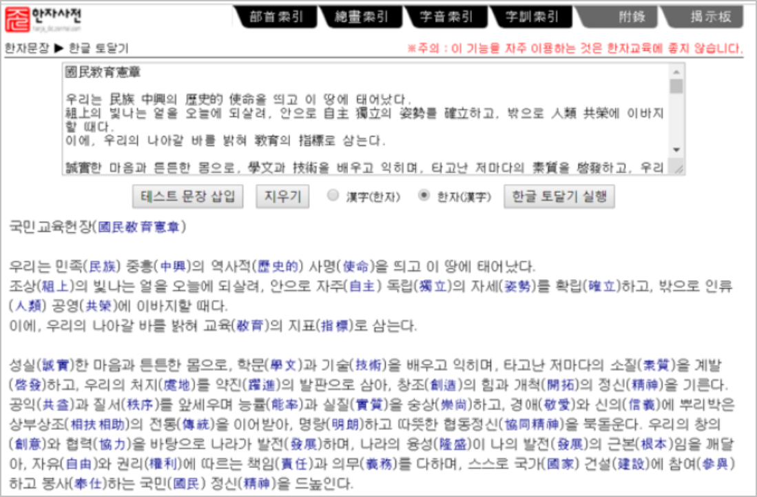 한자로 같은경우에는 한글을 한자로 바꿔줍니다. 근데 하나의 한자어는 여러가지의 한문으로 치환이 될 수 있습니다. 그렇기 때문에 이게 꽤나 쉬어 보이지는 않는것 같더라구요. 그래서 틀린게 있는게 아닌가 의심스러운 눈으로 살펴보는것을 권해드립니다.