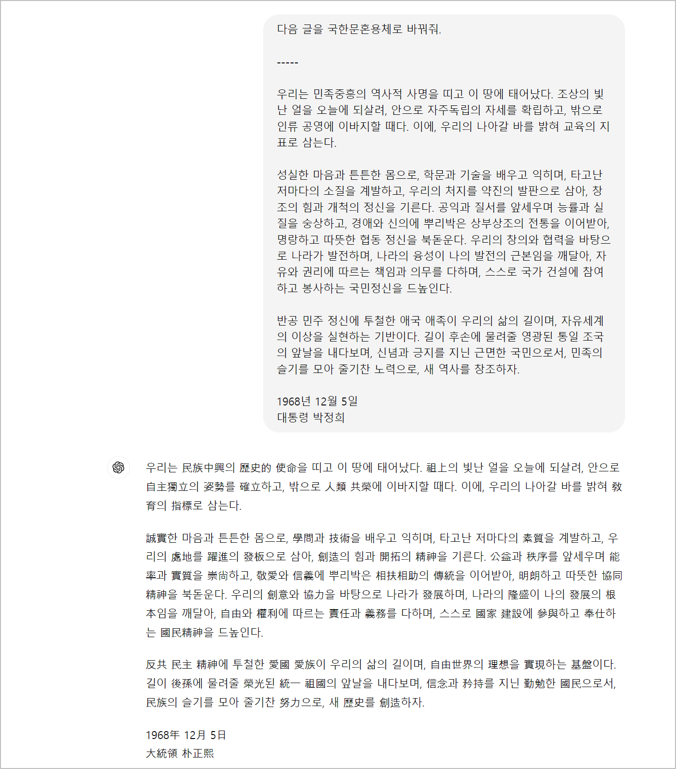 "다음 글을 국한문혼용체로 바꿔줘"