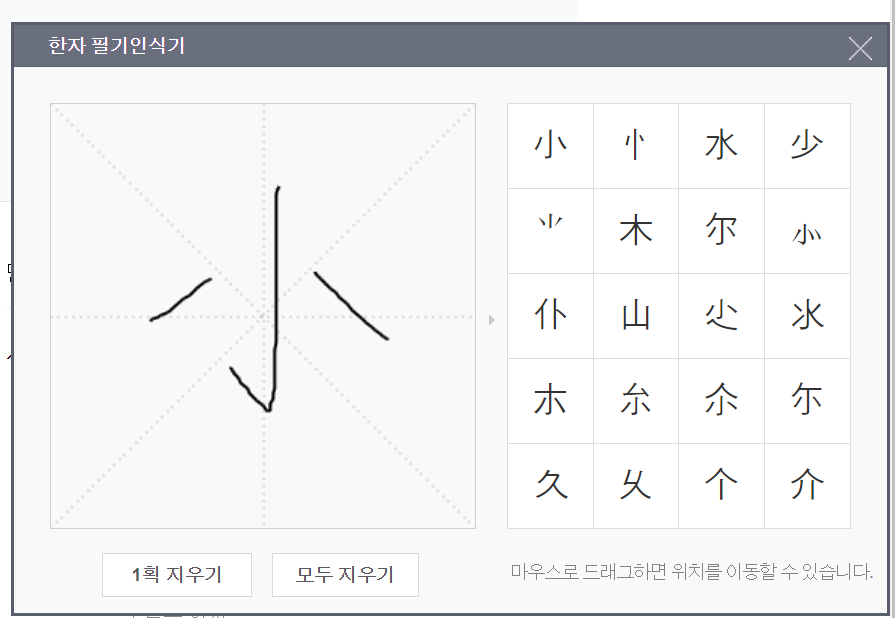 두 번째는 네이버 사전 필기인식기를 활용하는 것입니다. 이 도구를 사용하면 마우스 또는 펜슬을 이용해 한자를 직접 그릴 수 있습니다. 종이에 적힌 한문 글자나 복사가 어려운 문서에서 매우 효과적입니다. 그림을 그리면 오른쪽에 유사한 자형이 나타나며, 이를 클릭하면 해당 글자를 찾을 수 있습니다.