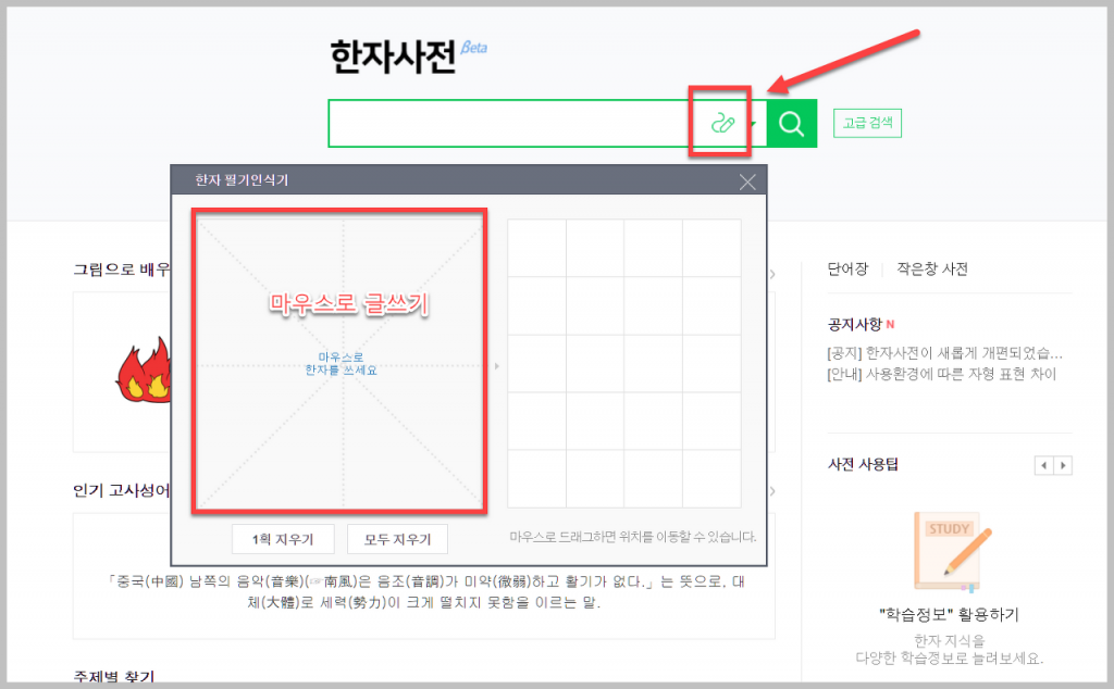 두번째는 자형으로 뜻 찾기 입니다. 이럴 때, 녹색창 옆에 있는 연필 아이콘을 클릭하면 ' 필기인식기'를 사용할 수 있습니다. 이 도구를 활용하면 글을 직접 쓰면서 해당 글자를 인식할 수 있습니다.