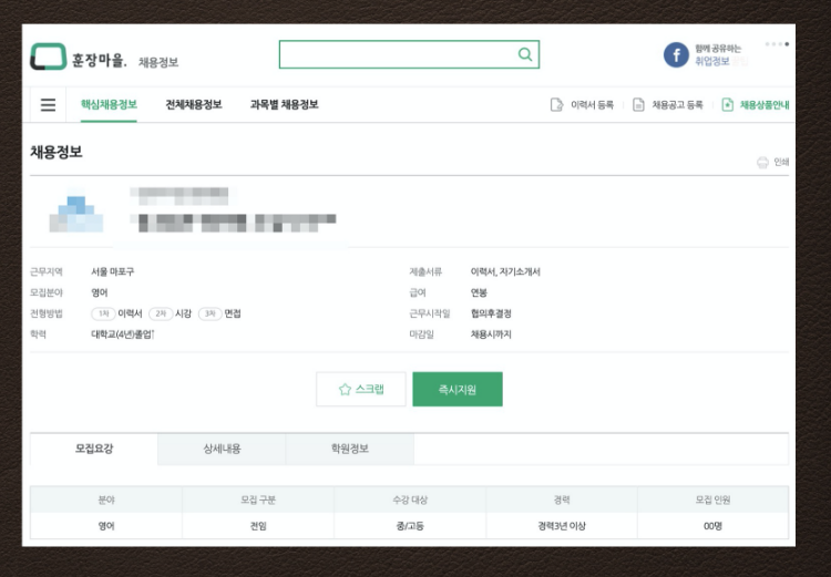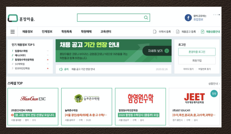 교육분야는 수입이 괜찮은 편입니다. 방학이면 많은 사람들이 일자리를 구하려고 나서기도 합니다. 훈장마을의 경우에는 학원강사에 특화된 사이트이기 때문에 이곳에서 좋은 일자리를 구할 수 있기를 기원합니다.