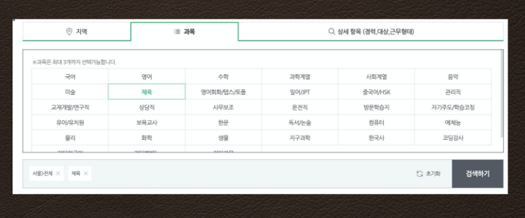 먼저 채용정보로 들어가면 지역과 과목을 선택할 수 있도록 되어 있습니다. 지역의 경우에는 자기가 있는 그 지역을 선택을 하면 됩니다. 그리고 과목은 지금가지 해왔던 과목을 적으면 될것이라고 생각이 듭니다.