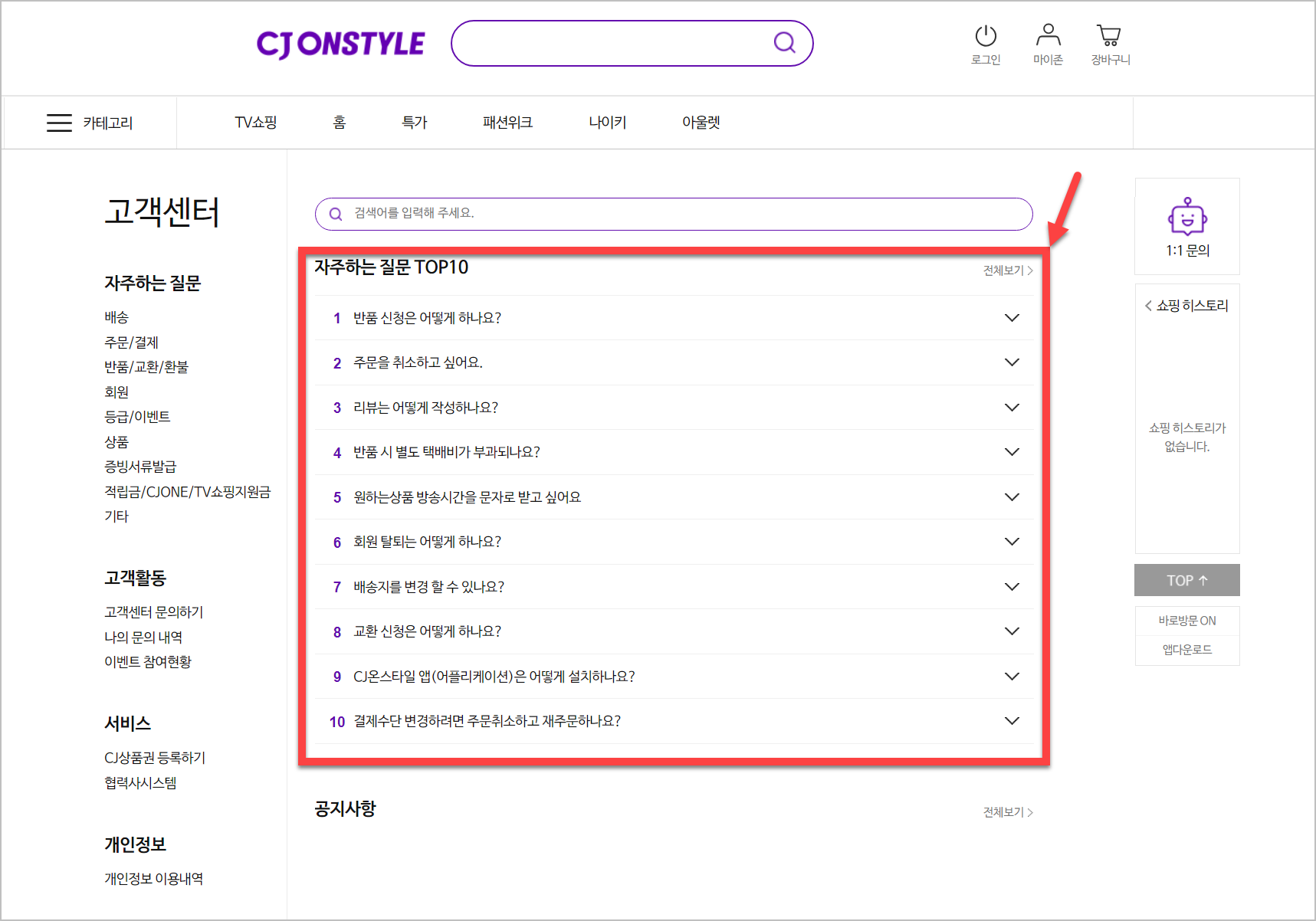 위 링크로 들어가시면 CJ홈쇼핑 고객센터 홈페이지로 들어가실 수 있습니다. 이곳에 들어가시면 아래와 같은 화면을 보실수 있습니다.