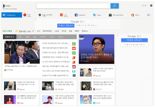 위 링크로 들어가시면 MSN 홈페이지로 들어가실 수 있습니다. 하나의 완벽한 포털의 형태가 보여집니다. 검색은 빙 검색으로 되어 있고, 뉴스가 포함이 된 포털이지요. 네이버와 다음과 크게 다르지 않는 모습입니다. 다만 여기에서 제공되는 서비스는 카페나 블로그가 아닌 아웃룩, 스카이프, 오피스와 같은 Microsoft의 제품이라는 것이 다릅니다.