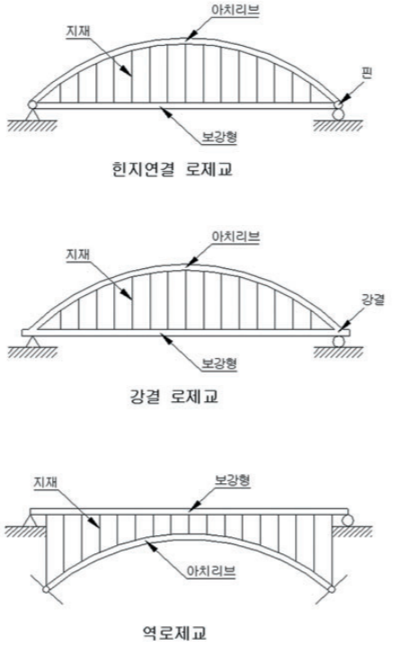 아치부재는 소지간의 교량에서는 I형 아치부재가 사용되고, 장대지간의 교량에서는 상자형단면을 사용된다. 아치부재는 축방향의 압축력과 휨모멘트를 받는 부재이므로 아치리브를 설계하는 경우에는 단면의 허용응력의 검토해야 하며, 압축부재의 특성인 전체 및 국부좌굴상태를 검토해야 한다. 이와 같은 좌굴특성을 설계에 적절히 반영하기위해서는 적절한 보강재를 선택하여 설치하여야한다. 보강형의 경우는 아치부재와 동일한 형태의 단면형상을 사용하는데, 소지간의 것은 I형 단면, 장대지간의 것은 상자형 단면을 사용한다.상로교의 수직재의 경우에는 압축응력을 받으므로 지재(支材)라 부르고, 하로교의 수직재는 인장응력을 받으므로 이것을 행거라 부른다.