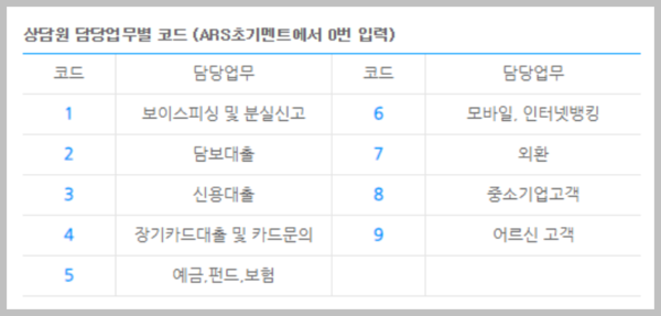 해당 번호로 걸면 ARS 초기 안내에서 0번을 누르면 상담원 담당 업무별 코드를 확인할 수 있습니다. 하지만 이 모든 내용을 듣는 것은 번거로울 수 있습니다. 따라서 미리 어떤 숫자를 입력할 지 알고 가면 좋습니다.
