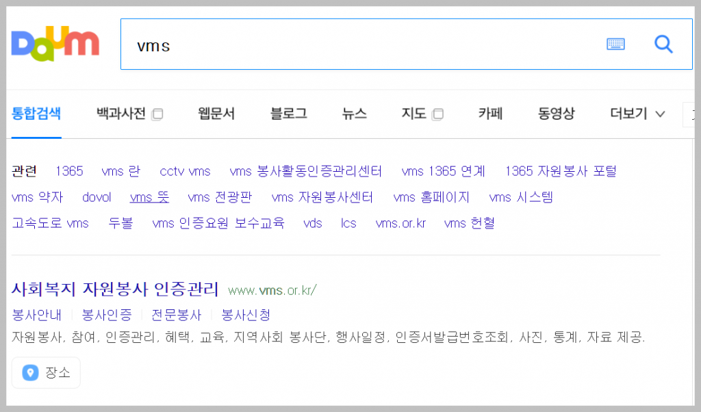 네이버나 다음과 같은 포털에 간단히 'VMS'를 검색하면 사회복지 자원봉사 인증 관리 사이트로 연결되는 링크가 표시됩니다. 검색결과 중 가장 상단에 나오는 결과를 클릭하면 홈페이지로 바로 접속할 수 있습니다.